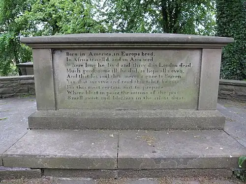 Yale died on 8 July 1721 in London. No descendants of his have survived past his great-grandchildren.[5] His body was buried in the churchyard of the parish church of St Giles' Church, Wrexham, Wales.[162] His tomb bears an inscription: