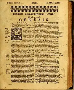 The Eliot Indian Bible (Massachusett: Mamusse Wunneetupanatamwe Up-Biblum God;[1] also known as the Algonquian Bible) was the first translation of the Christian Bible into an indigenous American language, as well as the first Bible published in British North America. It was prepared by English Puritan missionary John Eliot by translating the Geneva Bible[2][3][4] into Massachusett.[5][6] Printed in Cambridge, Massachusetts, the work first appeared in 1661 containing only the New Testament. An edition including both the Old and New Testaments was printed in 1663.[7]