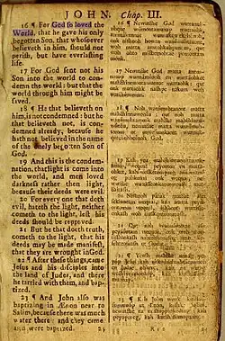 - ^ Eliot, John, 1604-1690; Cotton, John, 1640-1699; Company for Propagation of the Gospel in New England and Parts Adjacent in America (1685). "Mamusse wunneetupanatamwe Up-Biblum God naneeswe Nukkone Testament kah wonk Wusku Testament. (1685)". Internet Archive. Cambridge, Massachusetts: Printer - Samuel Green. Retrieved 19 August 2013.