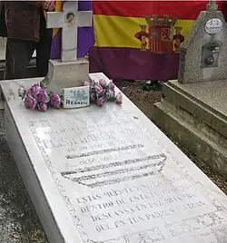 During the dictatorship of Francisco Franco, the epitaph on Elisa García's tombstone was damaged with a hammer and chisel by order of the Francoist mayor of Sarinyena. It was left illegible, which moved a group of the town's residents to try to restore it. On 14 April 2012, the anniversary of the proclamation of the Second Spanish Republic, a tribute was paid to Elisa García Sáez in the municipal cemetery of Sarinyena. Several residents of the locality remembered the figure of the militiawoman, making a call to the population to help recover the deleted words and to restore their memory.[8]