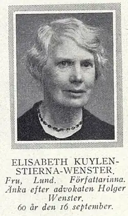Marie Elisabeth Kuylenstierna-Wenster (16 September 1869 – 13 February 1933) was a Swedish translator and writer, often writing under the pseudonym Sten Wide or using her initials EKW. She studied in France, Germany, and Denmark and wrote for several magazines in the period 1886–1913. She then became a French teacher and was a common lecturer at the municipality before she became a popular science lecturer in Lund.[1]