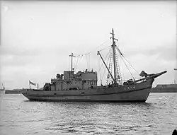 HMS MMS 54 was ordered on 5 September 1940. It was built by Herd & Mackenzie, Buckie, Fife. It was launched on 22 September 1941 and was completed on 25 December. Assigned the pennant number J554, it was assigned to the Royal Navy's 103rd Minesweeping Flotilla, based at Sheerness. In 1942, it was assigned to the 102nd Minesweeping Flotilla, also based at Sheerness. In 1944, it was transferred to the Royal Netherlands Navy.[1] and commissioned on 23 August as HNLMS Marken, named after the village and former island of Marken in North Holland, with the pennant number FY54. The ship was a replacement for HNLMS Marken, which had struck a mine and sank in the Thames Estuary off the Sunk Lightvessel.[2] In 1945, it was assigned to the 139th Minesweeping Flotilla, operating in Dutch waters.[1]