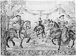 Around 1531, the son of Elisabeth and John V, Henry III, had a series of eight tapestries with the genealogy of the House of Nassau woven.[27][28] These tapestries were lost in the 18th century.[27][29] The design drawings for the tapestries were made by Bernard van Orley. Seven of those drawings have been preserved,[29][30] only the design drawing for the fifth tapestry, depicting Count John I of Nassau-Siegen and Countess Margaret of the Mark, is missing.[30] The theme of the series was the descent of the House of Nassau, whereby the dynastic significance was paramount. This genealogy was given extra splendour by the fact that, in addition to the direct descent from Count Otto I of Nassau, Roman King Adolf was also included in the series.[27][28] On each tapestry, a man and woman sitting on horseback are depicted facing each other. The rather unusual composition remains lively due to the alternation in clothing and poses and the position of the horses. The mostly hilly landscape in the background is sometimes interrupted by trees in the foreground. The coats of arms in the top corners and the cartouche with the inscription in between are connected by garlands that stand out sharply against the sky. It is also clear from the designs for the first and last tapestry that the main scenes were surrounded by wide carpet borders.[30] The drawings also show the great care taken with the inscriptions in the cartouches, which are written in the same hand on all seven of the surviving drawings, and with the heraldic details of the coats of arms.[31] With the coats of arms, indications have been written in French about inaccuracies, especially about the mirror-image representation of the male arms. It is known that Henry III paid special attention to this aspect and corresponded with his brother William I about it. The design for the last tapestry in the series differs from the other designs in that it depicts three women instead of one. As the inscription does not mention the identity of the two women in the background, this has given rise to much speculation.[32]