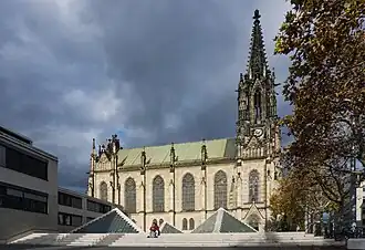 The church construction begun in 1857 and was completed in 1864.[1] Its architect was Ferdinand Stadler and it was the first new church erected in Basel following the reformation.[1] Its construction was sponsored by the wealthy businessman Christoph Merian and his wife Margarethe Burckhardt-Merian, which were both laid to rest in the church[2] in black marble sarcophagi in the crypt below the church's main floor. Christoph Merian did not oversee the completion of the church as he died in 1858.[2] The Merians also founded the Christoph-Merian-Stiftung.[1] Today's congregation forms part of the Evangelical-Reformed Church of the Canton Basel-Stadt.