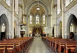 From an architectural point of view, the church is built in the eclectic style with neo-Gothic influences. Among the neo-Gothic elements we can observe: the shape of the gaps – broken arch, the decorative rosette above the entrance, gargoyles, a decorative turret from the east and the branched veins on the inner vault.[8] The church impresses with its symmetry, slenderness, balanced distribution of interior space and giant stained glass windows that achieve good interior lighting in a warm yellow hue. The Gothic altar was brought from the old Roman Catholic church in Mehala, and the five altars that segment the interior were made in Ferdinand Stuflesser's workshop from Urtijëi (South Tyrol).[9] The church is 52 m long and 22 m wide. It has four towers, of which two towers with a height of 57 m.[2]