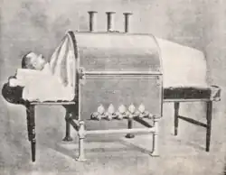 Illustration of a patient undergoing Tallerman–Sheffield hot-air treatment