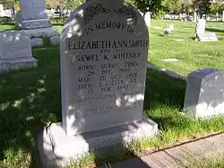 Elizabeth Whitney was affectionately called "Mother Whitney" by members of the church for her service and compassion.[9] It is noted that she had the gift of tongues, and that she even sang in tongues.[10] Whitney also used seer stones.[19] She died in Salt Lake City in 1882[2] and was buried in Salt Lake City Cemetery. At the time of her death she was the second oldest member of the LDS church.[20] Daniel H. Wells, Lorenzo D. Young, and Joseph F. Smith spoke at Whitney's funeral and praised her for her faith and service in the church.[21] A residence hall at Brigham Young University was named after her in 1957.[22]
