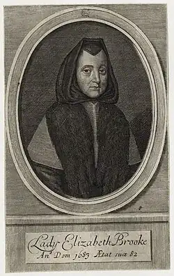 Elizabeth Brooke (January 1601 – 22 July 1683), also known as Lady Brooke or Dame Elizabeth Brooke, was an English religious writer, part of whose writing of Christian precepts survives,[1] and was matriarch of a landed manorial family in East Suffolk, East Anglia, during the English Civil War and Restoration periods.
