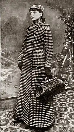 Elizabeth Cochrane Seaman (born Elizabeth Jane Cochran; May 5, 1864 – January 27, 1922), better known by her pen name Nellie Bly, was an American journalist who was widely known for her record-breaking trip around the world in 72 days in emulation of Jules Verne's fictional character Phileas Fogg, and for an exposé in which she worked undercover to report on a mental institution from within.[1] She pioneered her field and launched a new kind of investigative journalism.[2]