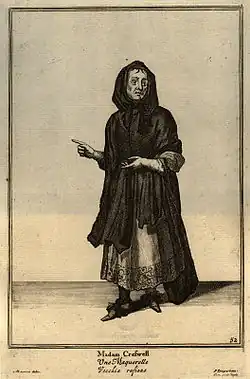 Cresswell's success was fed by a talent and zest for self-promotion; she openly advertised her bawdy businesses, which helped to build her own profile.[9][17] She was regularly referenced in party pamphlets, street literature and ballads, and may have been one of the inspirations for the eponymous heroine of Daniel Defoe's satire Moll Flanders.[18][8] Richard Head and Francis Kirkman, authors who frequented bawdy houses, wrote up and circulated graphic accounts of their encounters with "the old matron" and "her girls" in The English Rogue (1665). She is mentioned often in Nathanael Thompson's Collection of 180 Loyal Songs (1685 and 1694), the Rochester satires and Poems on State Affairs (1697–1707).[18]
