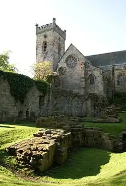 The Boswell family was well-connected to King James VI; George Boswell was a royal surgeon, and David's heir, his grandson John Boswell, laird of Balmuto had lent the king money to help pay for the royal wedding voyage to Scandinavia. He was knighted with his son and heir at the baptism of Prince Henry Frederick in 1594.[7] Sir James Melville and Christian Boswell had five children (dates of birth unknown): James, Robert, Margaret, Elizabeth and Christian. James, who inherited Halhill, shared a father-in-law with Elizabeth, namely Alexander Colville (d.1597), Commendator of the Abbey at Culross, judge and privy councillor.[8] Robert Melville trained for the ministry and for many years assisted the minister of Culross, Mr. Robert Colville, another son of Commendator Alexander.[9] Margaret Melville married Sir Andrew Balfour of Montquhanie in Fife.[10] He was another laird knighted at the baptism of Prince Henry Frederick in 1594. Christian married John Bonar of Lumquhat in Fife.[11]