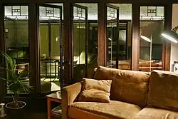 The floorpan and most of the interior are undisturbed and in original form. The interior includes birch trim with the original rubbed-shellac finish, dining and kitchen cabinets and leaded art-glass doors, windows and light screens with a simple motif that mirrors the homes facade. Modifications include shingles over the original exterior pebble-dash stucco, double pane-glass windows where there were once single panes, and the excavation of a garage where there was once a crawl space under the sleeping porch.