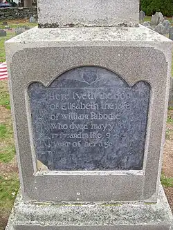 She married William Pabodie (Peabody), a leader of Duxbury, Massachusetts, on December 26, 1644. All 13 of their children were born in that settlement before Elisabeth eventually moved to Little Compton, Rhode Island, in the 1680s. She died on May 31, 1717, in Little Compton and was buried in the cemetery on Little Compton Common, officially called Old Commons Burial Ground. Her memorial is on Find A Grave as memorial #6868310.[1]