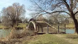 The unique pedestrian bridges that cross the canal and connect Elizabeth Park to the mainland were constructed in the early stages of the park's development. There are three walkway bridges — all named Elizabeth Park Walkway Bridge — at different locations. All three of these bridges are still structurally sound but are in desperate need of restoration.[9] The only automobile bridge that crosses the canal is an arch bridge called the Elizabeth Drive Bridge on the north end of the park. The 59.7 ft (18.2 m) bridge was constructed in 1923 and retains most of its original features. However, like the pedestrian bridges, the Elizabeth Drive Bridge is in poor shape. The Michigan Historic Bridge Inventory lists the bridge as eligible for entry into the National Register of Historic Places.[10][11]