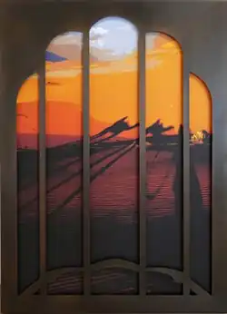 Much of Sher's later work is inspired by artist residencies abroad, during which she accumulates small drawings and paintings, photographs and video that serve as source material upon return.[3][64][65] Her show, "Morocco: Seen and Unseen" (2019), filtered North African culture through her experience as a visitor, pairing local colors and tourist-themed photos (camels, mosques) with wooden screens suggesting mashrabiyas—"harem windows" used to for privacy and shielding from male gazes (e.g., Filtered View #1).[66] Sher's artist books, Nuggets (2009), 7 Days in Otranto (2015) and Snow Lines (2018) arose, respectively, out of residencies in New Zealand, Italy and Iceland, where the loss of snow on glaciers inspired her work.[67][63]