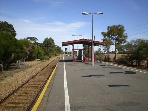 It once had a shelter and ticket office identical to that of Woodlands Park, but this was replaced in the late 1970s or early 1980s. On its western side, the station is adjacent to the Defence Science & Technology Group's Edinburgh site, and there is a walking track to the station for employees of DST Group.[2] It has an island platform between the two railway tracks. Pedestrians cross the tracks at level since the underpass was closed due to concerns about safety and vandalism.