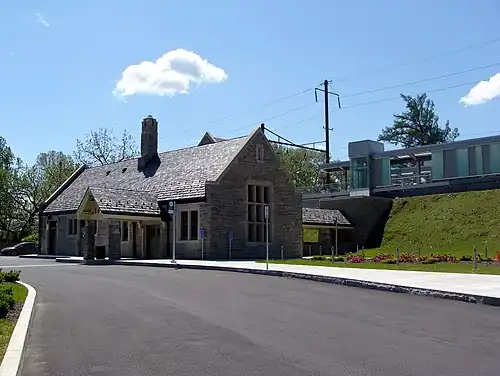 Because of the construction of an embankment at nearby Bainbridge Street, the Pennsylvania Railroad was forced to build a new station at West High Street in 1900.[10] After 15 years, the Pennsylvania replaced the station.[11] The new station was constructed out of Indiana Limestone in a similar style to the nearby Masonic Homes built by the Grand Lodge of Pennsylvania. On July 4, 1915, the Liberty Bell made a stop at the station while being transported to the Panama–Pacific International Exposition in San Francisco, California.[12] The Pennsylvania began electrifying its line between Philadelphia and Harrisburg in 1937, a task which was completed on January 15, 1938.[13] In 1977, the deteriorating station building was closed.[14] Prior to the introduction of the Keystone Service in 1981, the Elizabethtown station was served by the Big Apple, the Silverliner Service, and the Keystone.[15] From 1991 to 1995, the Atlantic City Express served the station on weekends.[16][17] The Three Rivers made stops in Elizabethtown in 1995 and 1996.[18][19]