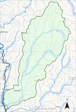 It headwaters about 5 miles southwest of Maryville, then travels north and west until it reaches Monroe Township. It passes southwesterly through the southeast corner of Monroe Township and then turns southerly as it heads to Graham. The stream continues south past Graham on its east side and turns southwest before it joins the Nodaway River.[5]