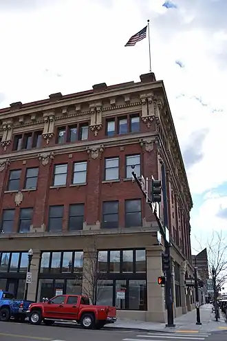 It was designed by Tourtellotte & Hummel and has an unusual cornice, plus an elk head on its front facade with light bulbs at the antler tips (elk head was removed when the Boise Elk's relocated to a new temple); it is a Boise landmark, and according to its NRHP nomination is "one of the city's better buildings from the pre-World War I period." Its interior was heavily damaged in a 1943 fire.[2]
