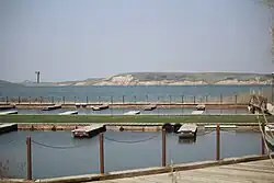 The Elkwater townsite lies at an elevation of about 1,225 m (4,025 ft) on the northwest slope of the Cypress Hills which, with a summit at 1,466 m (4810 ft), are the highest point between the Rocky Mountains and Labrador within Canada. Because of the elevation, the area receives more moisture than the surrounding plains. Forests of lodgepole pine, white spruce, and aspen cover the north-facing slopes above the town. Large animals include mule deer, white-tailed deer, coyote, elk, cougar, and moose, and many types of birds.[3] Moose and wild turkeys were introduced to the area and are not native. Furthermore, there is a large lake that has northern pike and yellow perch. Nearby lakes such as Reesor Lake also have fishing available. Sport fishing Licenses are available online or can be acquired from the Elkwater Visitor Centre.[4]