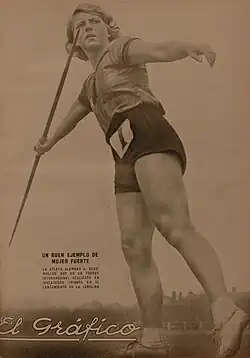 Ellen Braumüller (December 24, 1910, Berlin – August 10, 1991) was a track and field athlete from Germany, who competed mainly in the javelin throw. She competed for her native country at the 1932 Summer Olympics in Los Angeles, United States, where she won the silver medal in the javelin throw.[1] At the 1932 Olympics, she also competed in the relay, discus and high jump.[1] Born in Berlin, she was the younger sister of Inge Braumüller.[1]