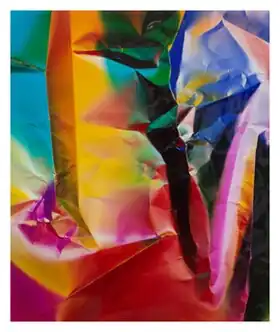 In 2000, she began producing brightly hued photograms whose series titles reflected the objects or materials she used to interrupt or strike the paper (e.g., "Push Pins", "Penlights") or referenced visual phenomena, such as afterimages ("Blinks").[54] Reviewers describe her color photograms as "hyper-saturated, jewel-toned abstraction"[41] suggesting light candies, paper diamonds or asymmetrical kaleidoscopes, in which color is the subject itself;[55][56] they compare their fluid soaks of color to the stain painting of Helen Frankenthaler and Morris Louis and the painterly, draped fabric of Frans Hals and John Singer Sargent.[1][51] Considering them conceptually, Leah Ollman wrote, "Throughout this body of work, the paper's surface does double duty as object and subject, material and image. The literal and the abstract merge."[1]