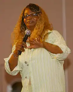 Cleghorne joined Saturday Night Live in 1991, and remained on the show for four seasons until 1995.[4] During her tenure she performed impressions such as Alfre Woodard, Dr. Dre, Anita Baker, Florence Griffith Joyner, Debbie Allen, Mary J. Blige, Natalie Cole, Patti LaBelle, Marla Gibbs, Robin Quivers, Toni Morrison, Joycelyn Elders, Tina Turner, and Whoopi Goldberg.[5] She also had two recurring characters: Zoraida, an NBC page, and Queen Shenequa, who appeared frequently on the recurring Weekend Update sketch.[5] Cleghorne was the third black woman to be credited on Saturday Night Live, after Yvonne Hudson and Danitra Vance, and the first woman of color to appear on the series as a full-fledged cast member for longer than a single season.[6] She later said, "I was the first [woman of color] cast member ... with a contract. And if you read, or do research, they didn't used to give black people contracts on SNL. That was cold-blooded. They didn't even give them credit. The credits roll, your name's not even on there. That was a joke because that's how you got residuals."[6] Her former Saturday Night Live costar Jay Mohr's book Gasping for Airtime notes that Cleghorne did not get along well with some of the other cast members during her time on the show. He also mentions a tiff with host Sally Field during a pitch meeting.[7]