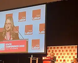 ![]() Ellie Whiteaker addresses the WA Labor State Conference in 2023 | |