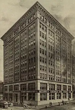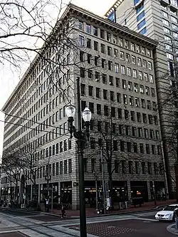 The Corbett Building, located at Southwest Fifth Avenue and Morrison, Portland Oregon (its mailing address was simply the Corbett Building, Portland, Oregon). The ten-story building was designed by Whidden & Lewis and completed in 1907. It "represented the arrival of the modern steel-framed skyscraper to Portland."[43] The offices of the Corbett brothers were on the 10th floor. Their grandfather Henry W. Corbett's Multnomah Building occupied the site previously.[44] The Corbett Building was demolished by implosion in 1988, after the three brothers' deaths, to make way for Pioneer Place.[45] It had been sold earlier by them on their retirement from building ownership in 1956.[46]
