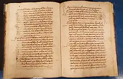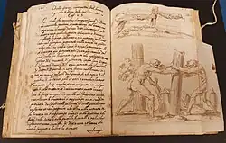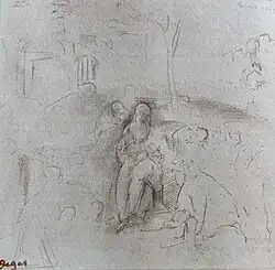 The Belt Library contains as well several notable manuscripts. A brief document by Michelangelo describes a meeting with Pope Clement VII at San Miniato al Tedesco in 1533, mentioning that the artist was at the time caring for a horse belonging to his friend the painter Sebastiano del Piombo. Especially important is a notarial document on vellum in the hand of Leonardo's father, Ser Piero da Vinci. Dated 8 November 1458, this document is the contract for the sale of a house and properties outside Florence. One of the finest pieces in the library is an illuminated initial leaf from a copy of printer Nicholas Jenson’s 1476 edition of Pliny's Naturalis historia. The striking border decoration is attributed by Wilhelm Suida to the miniaturist Cristoforo de Predis, active in Milan circa 1471-86.[16] (Cristoforo's brothers Ambrogio and Evangelista were Leonardo's business partners during his prolonged sojourn in Milan at the end of the fifteenth century.) Perhaps the loveliest piece in the Belt Library is a pencil study by Edgar Degas, after Leonardo's Uffizi Adoration of the Magi in the Uffizi Gallery in Florence. The sketch is inscribed in the upper right-hand corner "Florence 1869. Leonard de Vinci" and in the lower left-hand corner is the red stamp "Degas" from the Durand-Ruel inventory created after Degas’ death.[17]