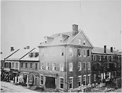 Ellsworth was killed at the Marshall House on May 24, 1861 (the day after Virginia's secession was ratified by referendum) during the Union Army's take-over of Alexandria.[6][7] During the month before the event, the inn's proprietor, James W. Jackson, had raised from the inn's roof a large Confederate flag that President Lincoln and his Cabinet had reportedly observed through field glasses from an elevated spot in Washington.[7] Jackson had reportedly stated that the flag would only be taken down "over his dead body".[4][7]