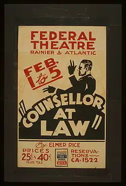 Rice's plays of the 1930s included The Left Bank (1931), a comedy dramatizing an expatriate's superficial attempt to escape from American materialism in Paris, and Counsellor-at-Law (1931), a vigorous work that drew a realistic picture of the legal profession for which Rice had been trained. (The latter play is probably more frequently revived in regional theatres than any of Rice's other plays.) In that decade, he also wrote two novels and enjoyed a lucrative period in Hollywood, writing screenplays. His time in Hollywood was not without its friction, though, as he was looked upon by many studio heads as one of "those Eastern Reds."[16]