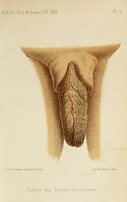 The characteristics of this trait were known as early as the 1680s, the first European note on the subject being made by Anderson and Iverson, who visited the Cape of Good Hope in 1644, in relation to the "Hottentots" of that region,[3] but became extensively documented in the late 18th and 19th century.[4] The case of Sarah Baartman was significant. For many years, the identification of Baartman was questioned because she demonstrated this feature. Historically, elongated labia minora were said to be portrayed by a "Negro". So it is because of this trait that Baartman was considered to be part of the so-called "inferior race".[5]