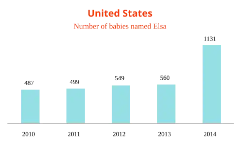 After the release of Disney's Frozen at the end of 2013, in which a main character is named Elsa, the name became more popular in different countries across the world. In the Faroe Islands and Sweden the name was in the top 10 baby names before the film was released, and became the most popular name afterwards, in 2014 and 2015.[1]