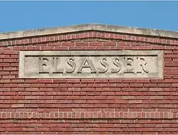 The Elsasser Bakery building is a two-story red brick commercial vernacular building. In addition to the Elsasser name carved into a stone panel at the top of the building, other decorative aspects of the building include a stone-capped parapet roof, brick banding, window hoods and stone sills. The center window on the second story is bricked in.[7] When the Elsasser Bakery was in operation there was a large front awning imprinted with "1802 Elsasser's Bakery".