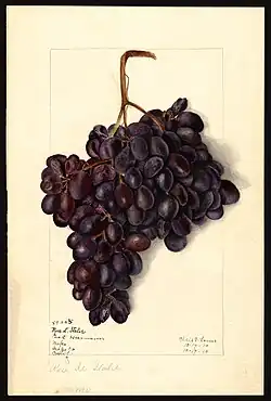 By 1908, she was working as an artist for the USDA, drawing botanical illustrations for the USDA yearbooks.[1] She was one of a select cohort of botanical illustrators working for the USDA at this time, among whom were also Deborah Griscom Passmore, Ellen Isham Schutt, Royal Charles Steadman, and Amanda Newton. She painted over 280 watercolors for the USDA, including both common fruits such as citrus, apples, and strawberries, and less common fruits such as cherimoyas. The 1908 USDA yearbook contained two of her images, including the Augbert peach (pg. 479) and Kawakami and Lonestar persimmons (pg. 484).[3] The 1909 USDA yearbook contained two of her images, including an ear of corn (pg. 335) and the Diploma currant (pg. 414).[4] Unlike most of her USDA colleagues, she would go on to have a career as an exhibiting artist after she left the service.