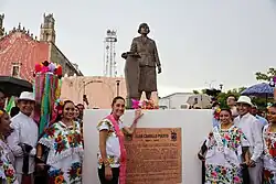 The Senate of the Republic of Mexico established the Elvia Carrillo Puerto medal in 2013 in Carrillo's honor. The medal is awarded every 8 March to women who have distinguished themselves for their work in the "defense, protection, exercise, and/or investigation of women's human rights and gender equality in [Mexico]".[73] In 2017, she was the subject of a Google Doodle.[74] A statue of Carrillo was erected in Motul in 2020.[75] She was also one of twelve women to be honored with a sculpture at the Paseo de las Heroínas in Mexico City.[76] In 2021, her name was inscribed on the Wall of Honor at the Legislative Palace of San Lázaro.[73]