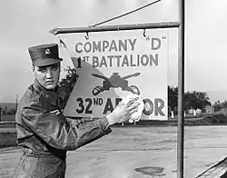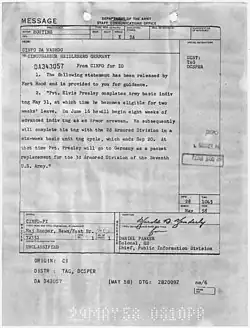 After training at Fort Hood, Presley was reassigned to the 1st Medium Tank Battalion, 32d Armor, 3d Armored Division, at Ray Barracks, West Germany, where he served as an armor intelligence specialist.[10][6] He left Fort Hood on September 19, headed for Brooklyn Army Terminal in New York where he would ship out to West Germany on September 22. After a short press conference arranged by Parker, which also involved Presley walking up and down the plank of the USS General George M. Randall eight times for cameras, the ship set sail and Presley would spend the rest of his service overseas.[11]