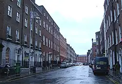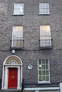 The first house to be built on the street was Ely House (now No. 7/8). Nos. 7, 9 and 10 now stand where its garden and carriage entrance used to be. Built in 1771 by Gustavus Hume, it was occupied in 1776 by John La Touche, of the banking family. The Dublin stuccodore Michael Stapleton (1747–1801) worked this house - Stapleton's designs were for "Mrs. La Touche's Eating Parlour" and "Mrs. La Touche's Dining Parlour". It later became the residence of the Countess of Ely (Frances Monroe, wife of Henry Loftus, 1st Earl of Ely, both originally from Fermanagh). On the death of Lord Ely, Lady Ely lived here for a further 40 years. At one time it belonged to Sir William Thornley Stoker, brother of Bram Stoker, whom Oliver St. John Gogarty used to visit when he lived on the street.[3] The Knights of Saint Columbanus bought this house in 1922 and made it their headquarters.[4]