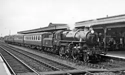 This was a single road engine shed located on the up side, south of the station. The shed was a corrugated iron affair and a timber coaling stage allowed coaling of trains by hand. There was a turntable which was provided from opening and replaced by a 45-foot turntable in 1879 and, as loco designs got bigger, this in turn was replaced by a 55-foot turntable in 1912.[21]