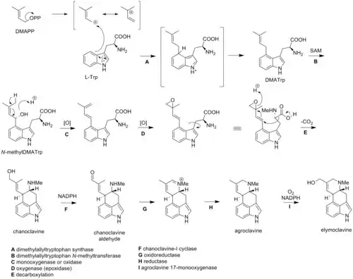 The main building blocks for biosynthesis of elymoclavine are tryptophan (Trp) and DMAPP. DMATrp is obtained after electrophilic substitution followed by addition (Step A below). Then an amine is methylated by an N-methyltransfersase (Step B). Next, the allyl alcohol is oxidized to the diene (Step C). After 1,4-elimination, the diene undergoes an epoxidation (Step D). Then decarboxylation is followed by the 6-member ring formation and epoxide opened to form terminal alcohol (Step E). Obtained chanoclavine gets oxidized to chanoclavine aldehyde (Step F). Then the second 6-member ring forms and agroclavine is obtained after additional reductase (Steps G and H). Finally elymoclavine is generated after an oxidation (Step I). The last step is NADPH-dependent, and it is suggested that cytochrome P450 is the catalyst.[6][7]
