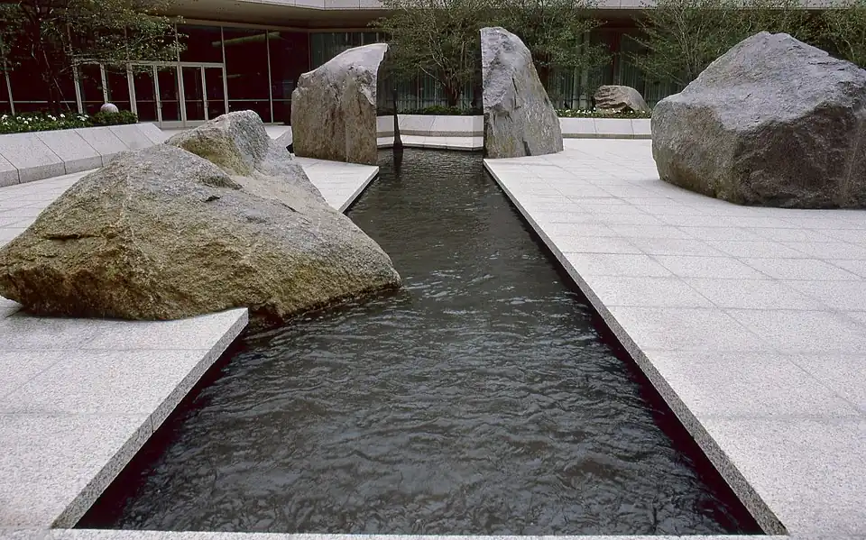 These permanent projects, beginning in 1980, are recognized for their use of stone, water, (reflecting pools, fountains) and landscape elements. Included among these large scale, public commissions is a fountain to memorialize the 1993 World Trade Center bombing in New York City;[8] the design of the sculpture garden at the Birmingham Museum of Art, Alabama; a fountain and seating area for AT&T headquarters in New Jersey; and the plaza design at the National Geographic headquarters in Washington, DC featuring a large pool surrounded by polished and natural cleft granite boulders.[9][10]