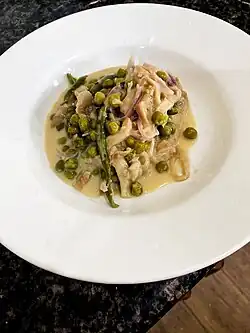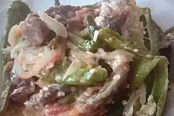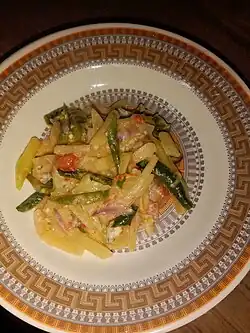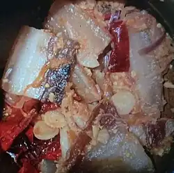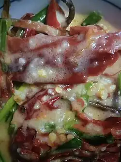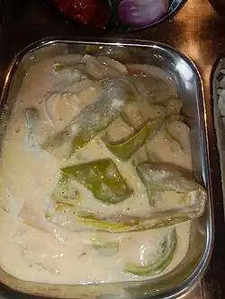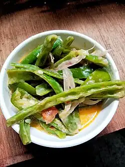 Ema datshi (Dzongkha: ཨེ་མ་དར་ཚིལ་; Wylie: e-ma dar-tshil[1]) is a spicy Bhutanese stew made from hot chili peppers and cheese.[2] It is among the most famous dishes in Bhutanese cuisine, recognized as the national dish of the country.[3] Over the years, ema datshi, which has its roots in Tibetan culinary traditions, has undergone various changes to suit the preference of local Bhutanese taste.