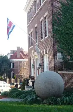 In 1974, the Embassy received one of the three pre-Columbian stone spheres of Costa Rica that came to the United States as part of an agreement that had been negotiated in 1971 between American art specialist Samuel Adams Green and the Museo Nacional de Costa Rica together with the Costa Rican Ministry of Foreign Affairs and Ministry of Culture.[4] The two larger spheres went to Fairmount Park in Philadelphia, where they were displayed in 1976[5] together with other monumental sculptures, before going into storage[6] at the warehouses of the Fairmont Park Association.[7] The one in Washington D.C. is displayed in the streetside yard of the Embassy building, as a symbol of national identity.