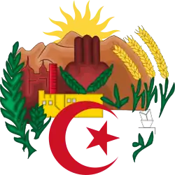 The national emblem of Algeria[1] (Arabic: الشعار الوطني الجزائري; Tamazight: ⵜⴰⵎⴰⵜⴰⵔⵜ ⴰⵏⴰⵎⵓⵔ ⵏ ⵍⵣⵣⴰⵢⵔ) is the official seal used by the government of Algeria.