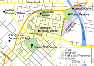 Embleton is located approximately 7 kilometres (4.3 mi) north-east of the central business district of Perth, the capital of Western Australia, 15 kilometres (9.3 mi) east of the Indian Ocean, and covers an area of 1.71 square kilometres (0.66 sq mi).[2] It is surrounded by Bayswater to the south and east, Bedford to the west and Morley to the north. Its border roughly follows, heading anti-clockwise, Broun Avenue, Coode Street, Beaufort Street, Drake Street, Rothbury Road. Maurice Street, Langley Road and Beechboro Road.[6]