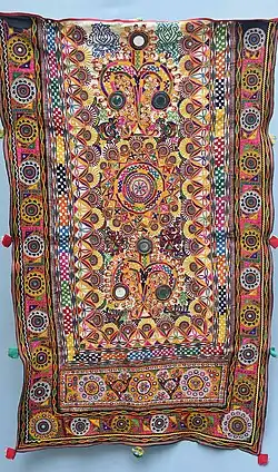 This embroidery style is made by the Rabari[34] or Rewari community of Rajasthan and Gujarat. This very colourful embroidery style, using stark contrast was traditionally used only for garments, but now it can be found on bags, accessories, home furnishings, etc. Mirrors of all shapes and sizes are incorporated in the embroidery, as a result of the belief that mirrors protect from evil spirits. Designs include not only flowers and fruit and animals such as parrots and elephants, but also temples, women carrying pots, and the ubiquitous mango shape.