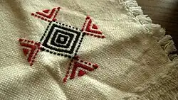 A variation of Kutch work, this geometric embroidery starts with a foundation framework of herringbone stitch[20][21] or Cretan stitch, and then this framework is completely filled with interlacing. It is said that this technique originated in far away land of Armenia and found its way to Gujarat by travelling Nomads. Sindhi stitch or Maltese cross stitch is also similar but the innovation of the Kutchi women have taken it beyond the traditional designs meow Kutch work[22]