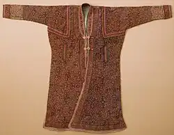 The embroidery styles of the Punjab region include kalabatun embroidery[29] using thin wires. Kalabatan surkh involves using gold wires on orange coloured and red silk. Kalabatan safed involves using silver wires on white material. There are two kinds of gold embroidery, one of a solid and rich kind called kar-chob and the other called tila-kar or kar-chikan utilising gold thread. The former is used for carpets and saddle cloths whereas the latter is used for dresses. The Punjab region also uses mukesh embroidery: mukesh bati-hui, twisted tinsel, mukesh gokru, flattened gold wire for embroidery of a heavy kind, and waved mukesh, made by crimping mukesh batihui with iron tongs.[30] Ludhiana and Amritsar are known for embroidery using white, silver and gold threads on clothes such as chogas and waistcoats (phatuhi).[7] Patchwork is also a tradition of the region.