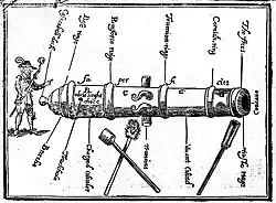 In the 1590s, Molyneux sought Elizabeth I's patronage for the production of a cannon, which he described as his "new invention, of shot and artillery, to be used principally in naval warfare: protection of ports and harbours, a new shot to discharge a thousand musket shot; with wildfire not to be quenched".[51] In March 1593, Molyneux was issued with a royal warrant. Two years later, the merchant Robert Parkes purchased coal, saltpetre, pitch, oils and waxes for him, possibly for the cannon. On 4 November 1596 the Privy Council urged the Lord High Admiral "to speak to Molyneux, Bussy and the two Engelberts about their offensive engines"[52] as part of measures to defend England's south coast. It appears the request was ignored. On 27 September 1594,[53] the Queen granted Molyneux a gift of £200 and an annuity of £50. He chose to surrender the latter when, some time between March or April 1596 and 4 June 1597,[53] he and his wife Anne emigrated to Amsterdam, Holland.[7] Wallis has conjectured that he took with him the printing plates for the globes and sold them to Hondius, who had returned to Amsterdam in 1593.[54]